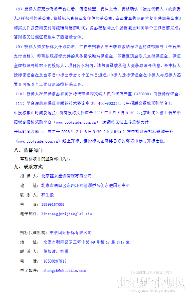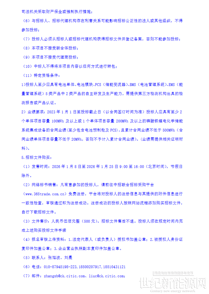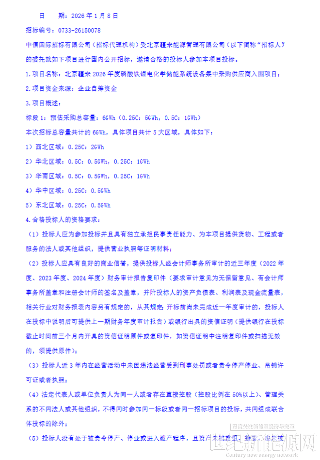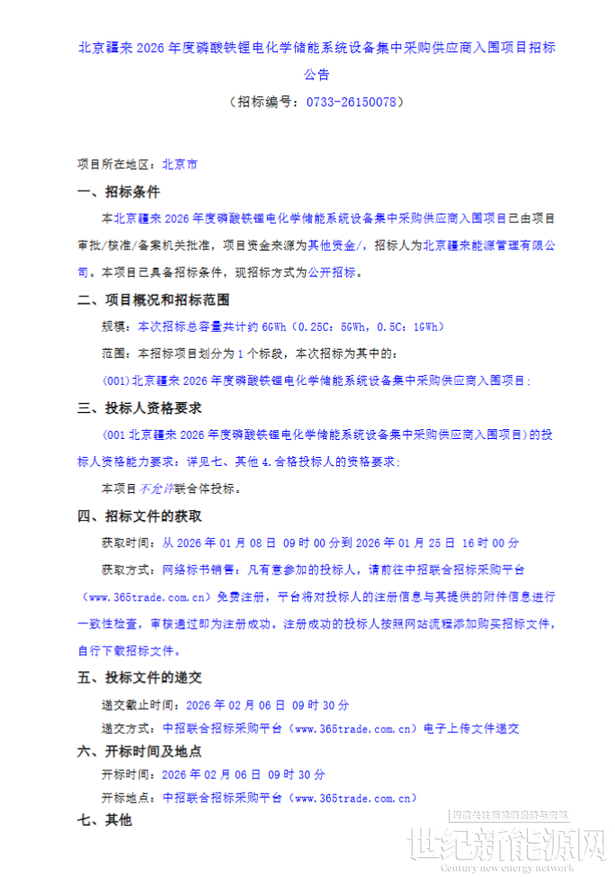 1月8日,北京疆来2026年度磷酸铁锂电化学储能系统设备集中采购供应商入围项目-公开招标公告发布。