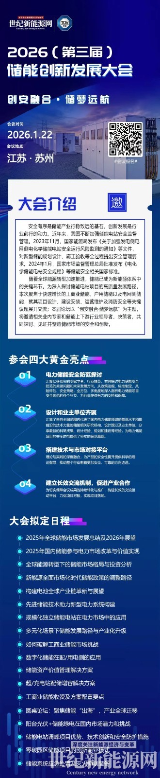 2026年1月22日,由TÜV南德、世纪新能源网、世纪储能联合举办的“2026(第三届)储能创新发展大会”,将于江苏苏州召开。届时会议将邀请来自能源主管部门、智库学术机构、知名储能企业及储能项目业主单位等领域的重量级嘉宾,为大会带来最前沿的储能安全技术与创新理念。会议聚焦快速增长的工商业储能、户用储能以及电网侧储能,就其项目设计、建设安装、运营维护及消防安全等关键议题展开交流。通过圆桌对话、专题讲座、案例分析等多种形式,为与会者提供一个全面了解储能行业的机会,同时搭建一个高效的合作交流平台。