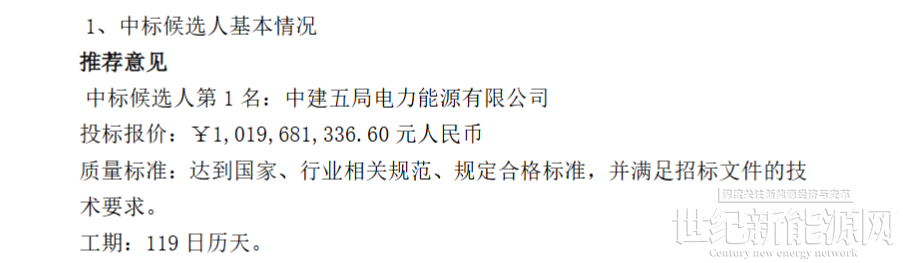 根据此前的中标候选人公示显示,中建五局电力能源有限公司以10.2亿元中标,折合单价约为1.275元/Wh。