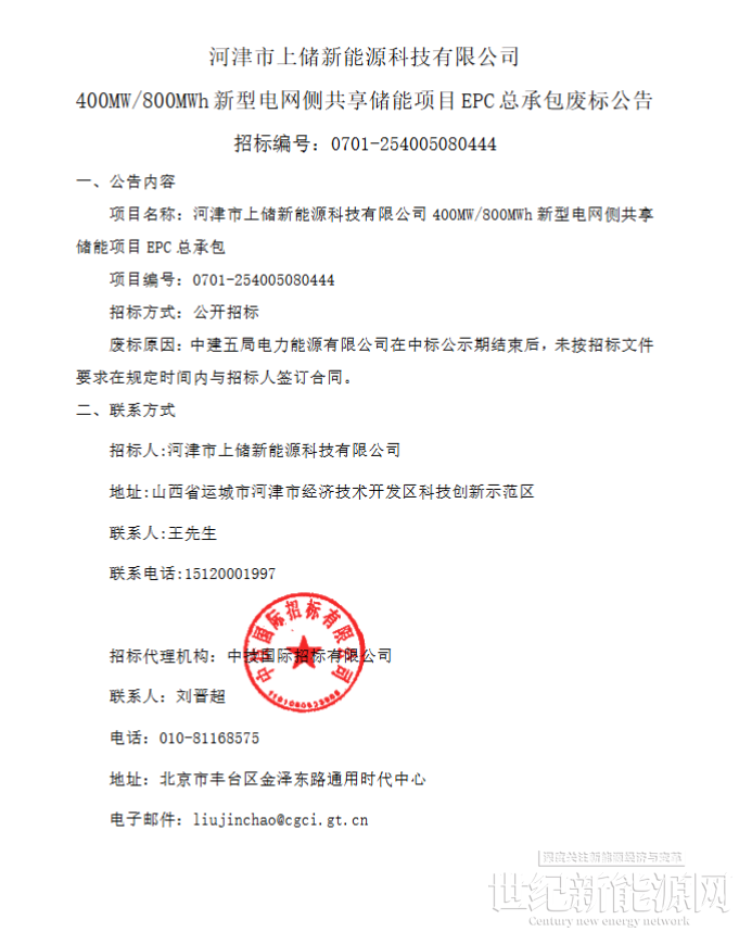 1月9日,河津市上储新能源科技有限公司400MW/800MWh新型电网侧共享储能项目EPC总承包废标公告。此次招标包括400MW/800MWh储能电站场区、220kV升压站及外送线路的初步设计至整体竣工验收的全部勘察设计等。