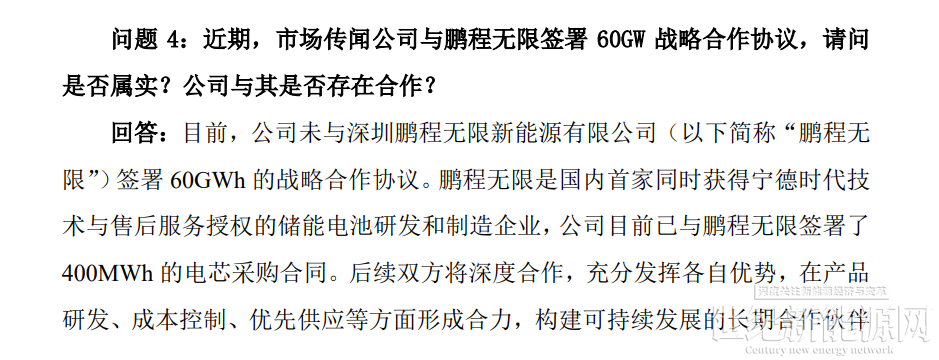 海希通讯明确表示,目前公司未与深圳鹏程无限新能源有限公司签署60GWh的战略合作协议,但双方签署共计400MWh的电芯采购合同。