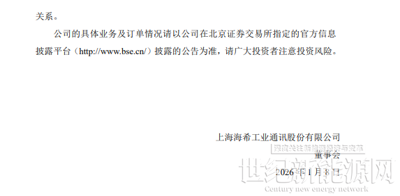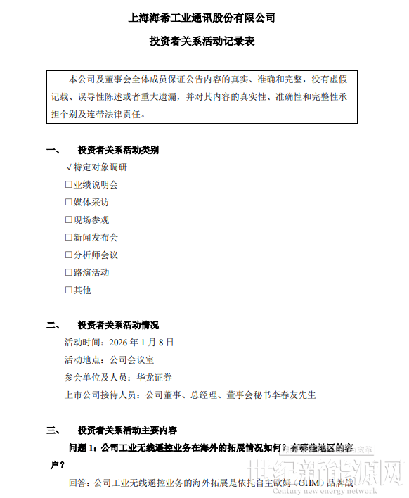 1月8日,上海海希工业通讯股份有限公司发布“投资者关系活动记录表”,其中企业储能大单签约部分引发关注。