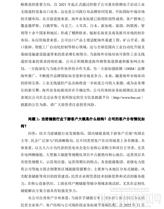 海希通讯还提及,从公司自身客户分布来看,当前在手储能订单主要来源于地方国企及优质民营企业客户;自2025年11月以来,公司也陆续斩获多个大额储能订单,未来预计将在电网侧、大型独立储能等高端市场将取得积极进展。