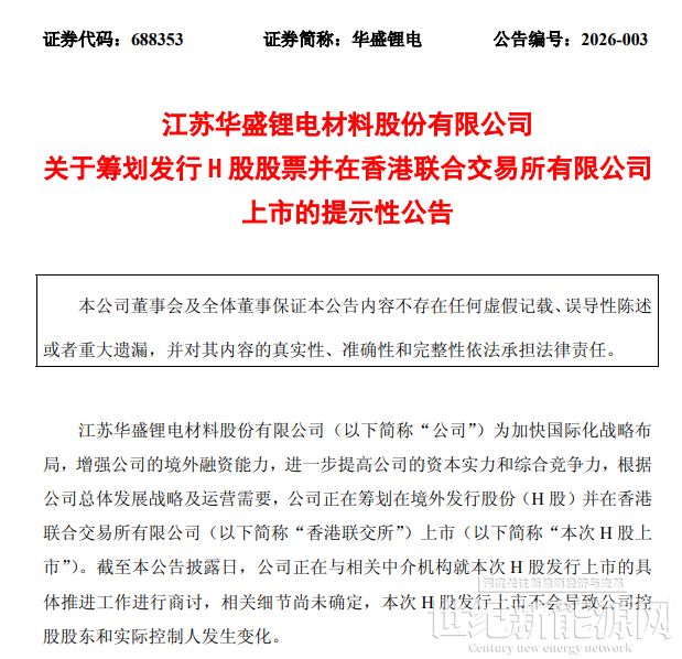 1月8日,华盛锂电发布公告,公司正在筹划在境外发行股份(H股)并在香港联合交易所有限公司上市。