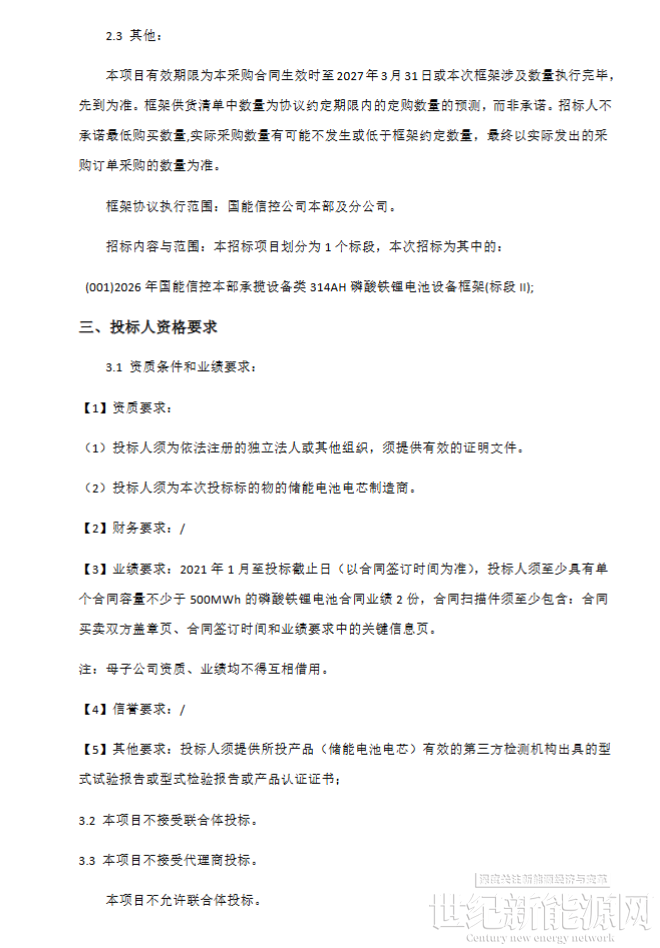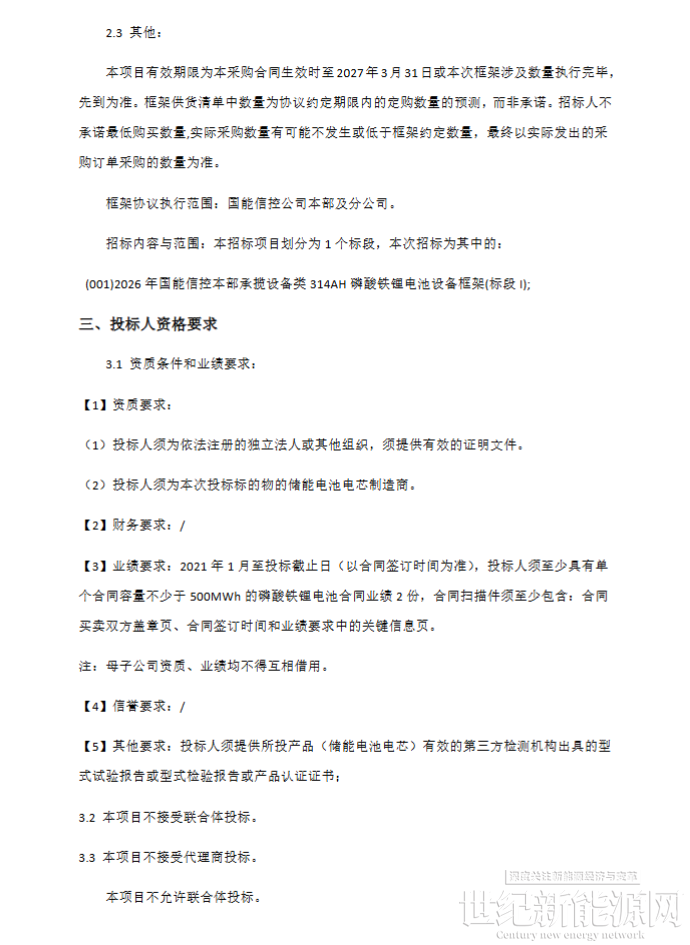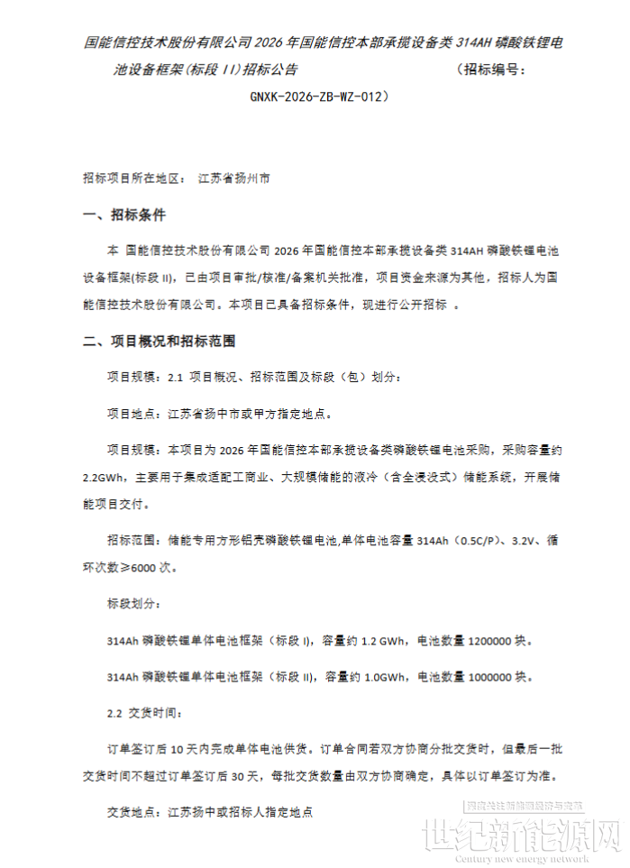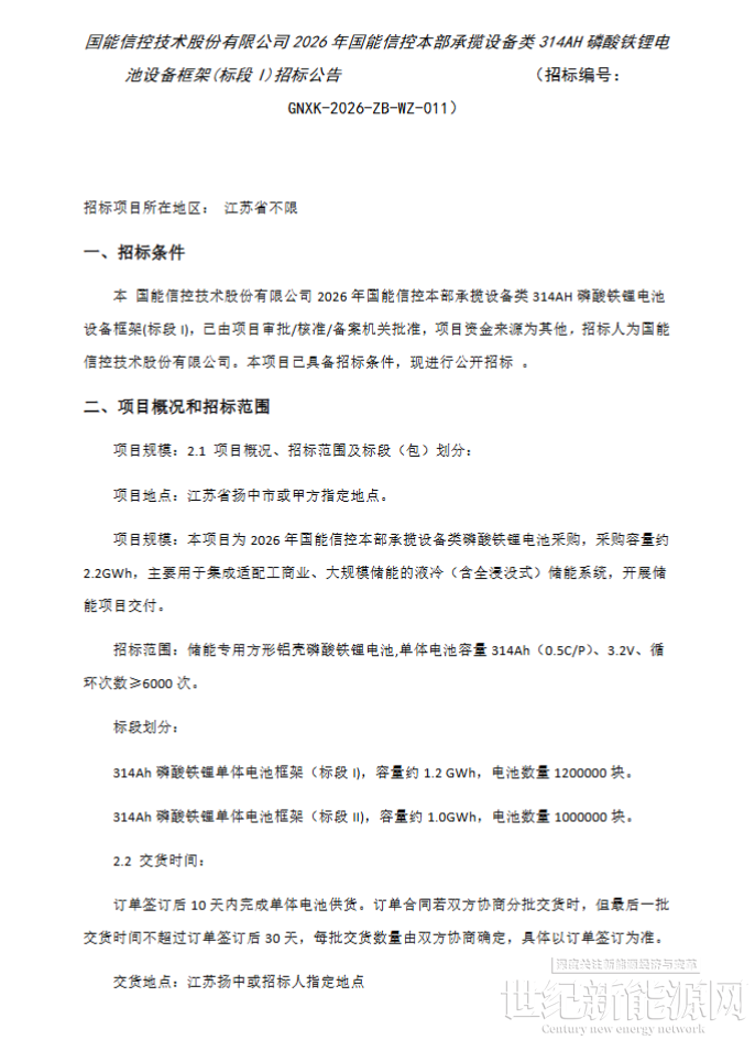 1月9日,国能信控技术股份有限公司2026年国能信控本部承揽设备类314AH磷酸铁锂电池设备框架招标公告发布。