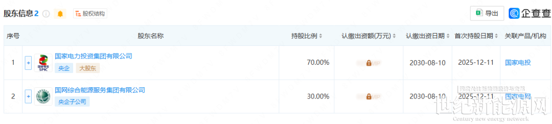 企查查股权穿透显示,该公司由国家电投集团、国网综合能源服务有限公司共同出资设立,占比分别为70%、30%,其中国网综合能源服务有限公司为国家电网有限公司全资子公司。