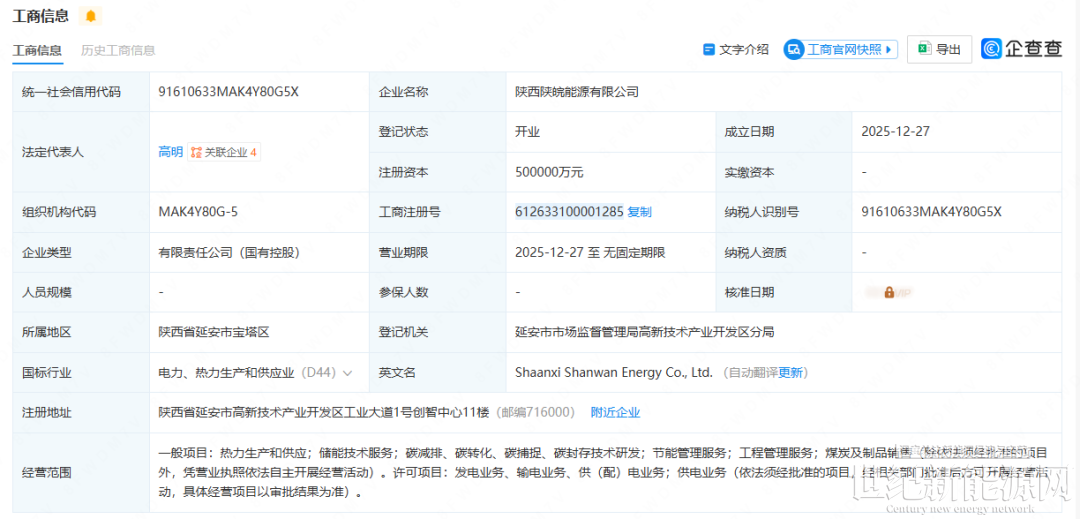 近日,陕西陕皖能源有限公司在延安成立,注册资本为50亿元,主营业务包括热力生产和供应;储能技术服务;碳减排、碳转化、碳捕抓、碳封存技术研发;节能管理服务等。