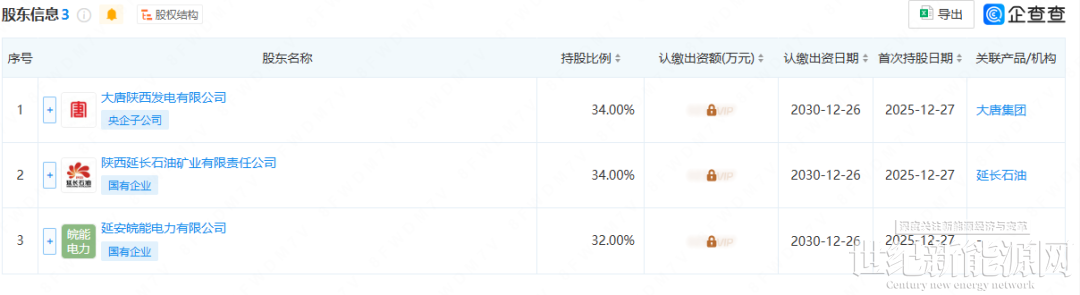 该企业由大唐集团、延长石油、皖能集团三家企业共同出资,持股分别为34%、34%、32%。