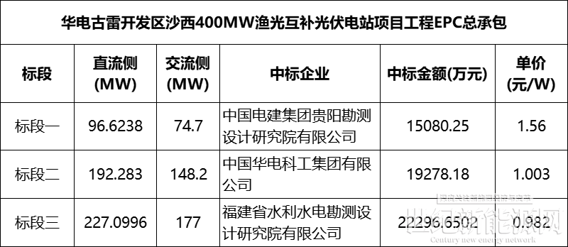 本项目分为3个标段,中标企业分别为中国电建集团贵阳勘测设计研究院有限公司、中国华电科工集团有限公司、福建省水利水电勘测设计研究院有限公司。单价区间在0.982-1.56元/W。