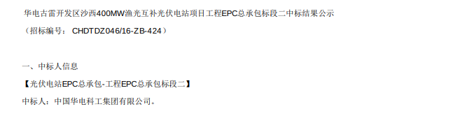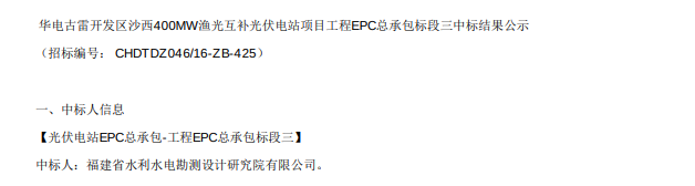 1月7日,华电古雷开发区沙西400MW渔光互补光伏电站项目工程EPC总承包招标项目中标结果公示。