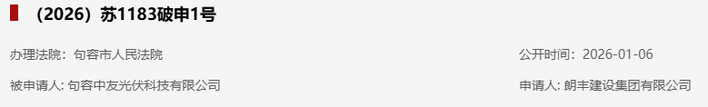 近日,朗丰建设集团有限公司向江苏镇江句容市人民法院提出对句容中友光伏科技有限公司进行破产申请,公开时间为2026年1月6日,案号为(2026)苏1183破申1号。