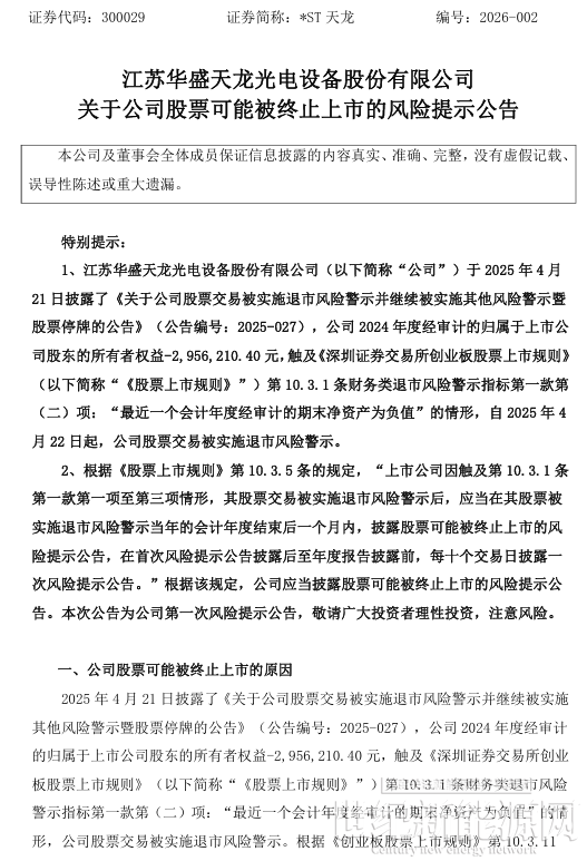 1月6日,光伏老兵*ST天龙发布退市风险提示公告。公告显示,公司2024年经审计的净资产只剩-295.62万元,触发创业板退市警示。
