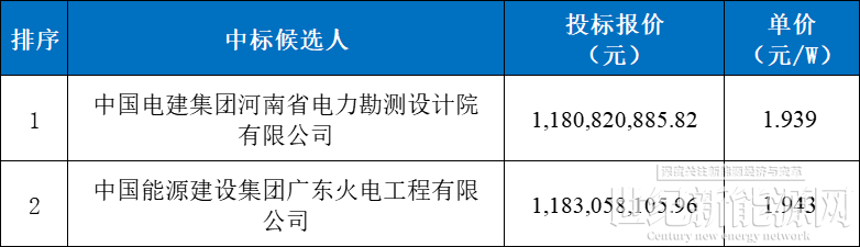 根据中标候选人公示,中国电建集团河南省电力勘测设计院有限公司以1.939元/W位列第一候选人,具体如下:
