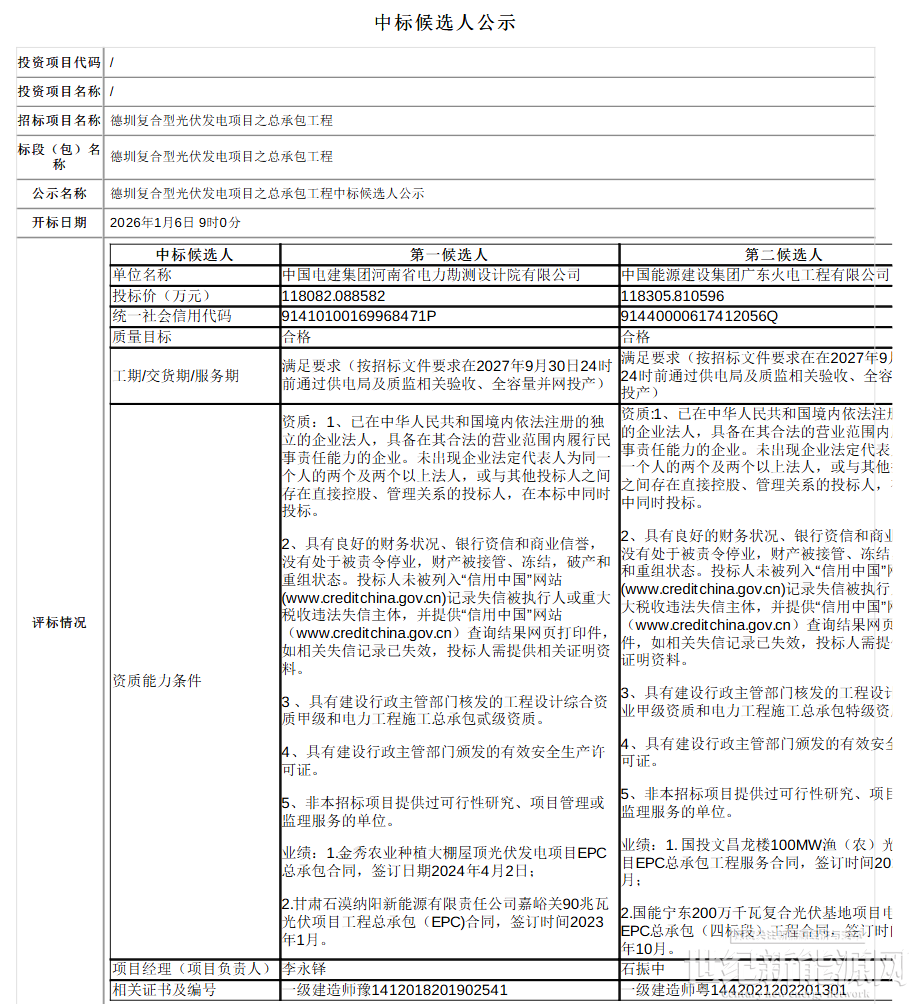 1月9日,德圳复合型光伏发电项目总承包工程中标候选人公示,项目招标人为衡东凌南新能源有限公司。项目规划交流侧建设总容量500MW(直流侧容量609MWp)。