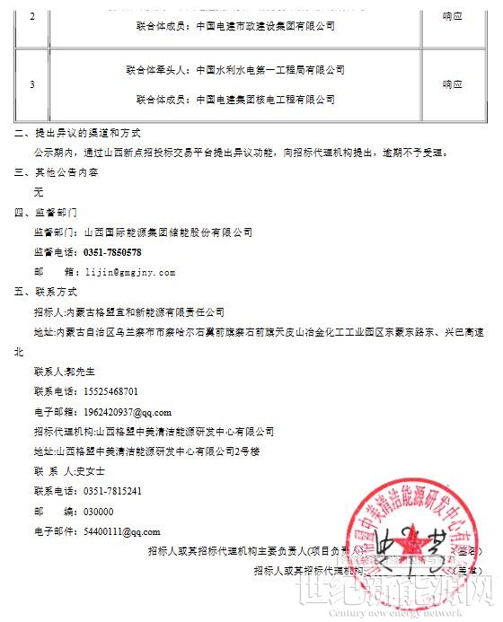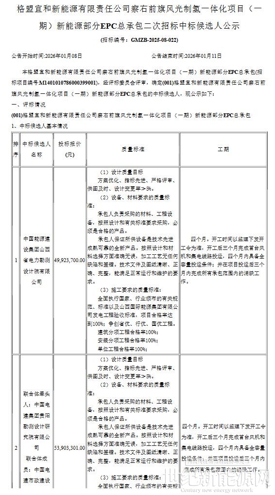 近日,格盟宜和新能源有限责任公司察右前旗风光制氢一体化项目(一期)新能源部分EPC总承包二次招标中标候选人公示。