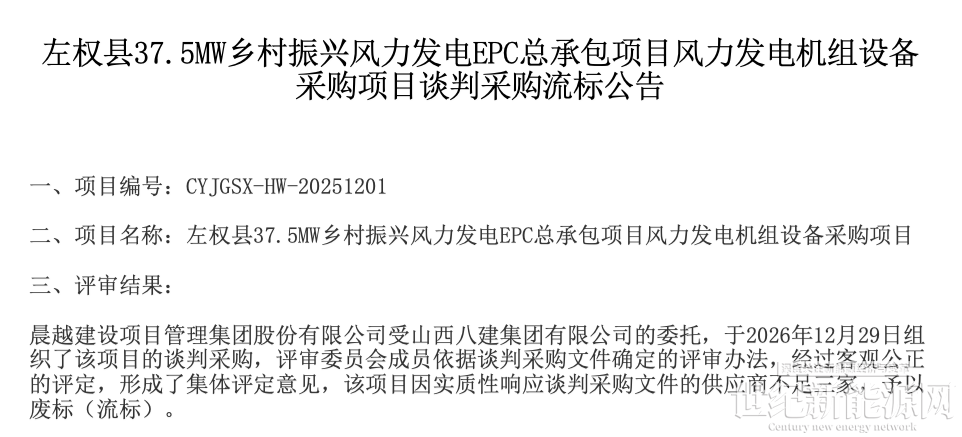 近日,山西左权县37.5MW乡村振兴风力发电EPC总承包项目发布机组采购因实质性响应供应商不足三家被废标(流标)。