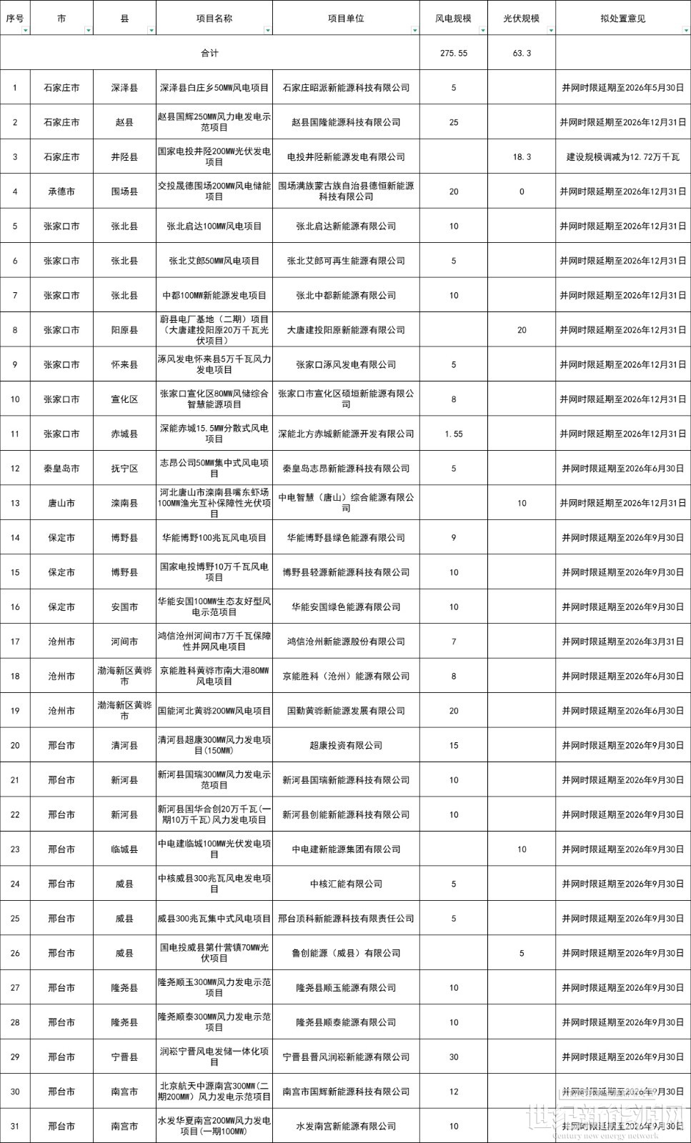 按照《河北省风电、光伏发电项目开发建设管理办法(试行)》要求,请各市进一步加强风电、光伏发电项目管理,推动后续项目严格按照并网时限要求建成并网,除不可抗力等客观因素造成项目不能按期全容量投产的,未并网的项目一律取消、未并网的规模全部调减。