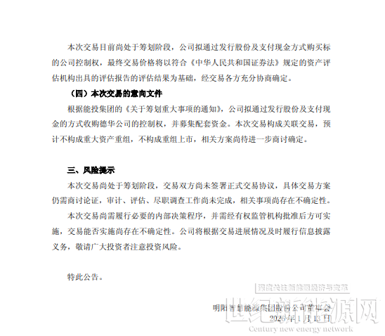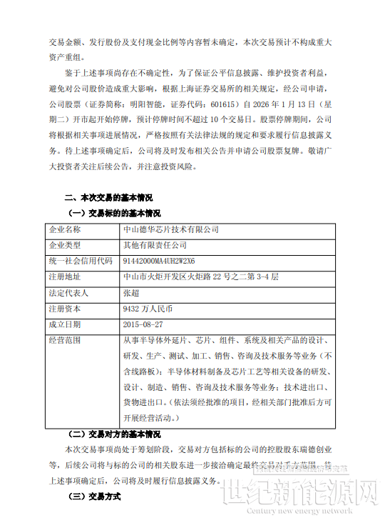 2026年1月13日,明阳智能发布《关于筹划发行股份及支付现金购买资产并募集配套资金暨关联交易事项的停牌公告》。