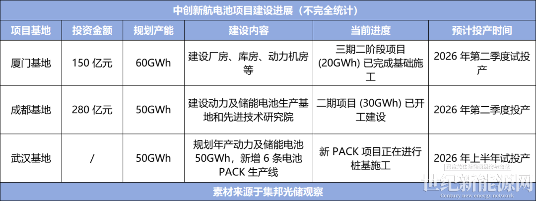 其中,中创新航成都项目二期于3月份开工,总投资120亿元,主要建设30GWh动力及储能电池生产基地和先进技术研究院,计划2026年第二季度投产。项目建成后,中创新航成都基地(一期+二期)可形成年产动力电池及储能系统50GWh的生产能力。