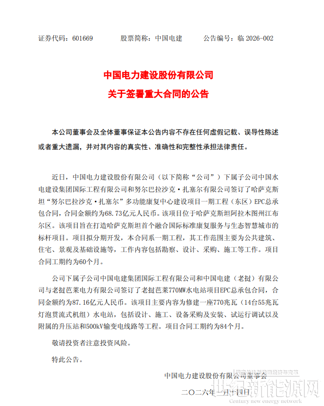 1月13日,中国电建(601669)公告称,近日,公司下属子公司中国水电建设集团国际工程有限公司和努尔巴拉沙克·扎塞尔有限公司签订了哈萨克斯坦“努尔巴拉沙克·扎塞尔”多功能康复中心建设项目一期工程(东区)EPC总承包合同,合同金额约为68.73亿元人民币。