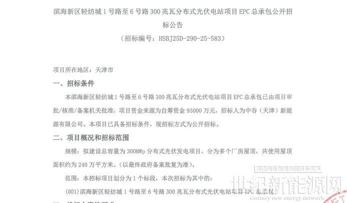 本滨海新区轻纺城1号路至6号路300兆瓦分布式光伏电站项目EPC总承包已由项目审批/核准/备案机关批准,项目资金来源为自筹资金93000万元,招标人为中谷(天津)新能源有限公司。本项目己具备招标条件,现招标方式为公开招标。