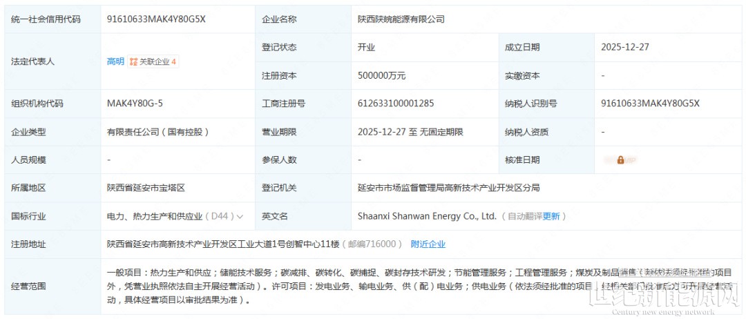 企查查显示,日前,陕西陕皖能源有限公司成立,注册资本500000万元,法定代表人为高明,经营范围:一般项目:热力生产和供应;储能技术服务;碳减排、碳转化、碳捕捉、碳封存技术研发;节能管理服务;工程管理服务;煤炭及制品销售(除依法须经批准的项目外,凭营业执照依法自主开展经营活动)。许可项目:发电业务、输电业务、供(配)电业务;供电业务(依法须经批准的项目,经相关部门批准后方可开展经营活动,具体经营项目以审批结果为准)。