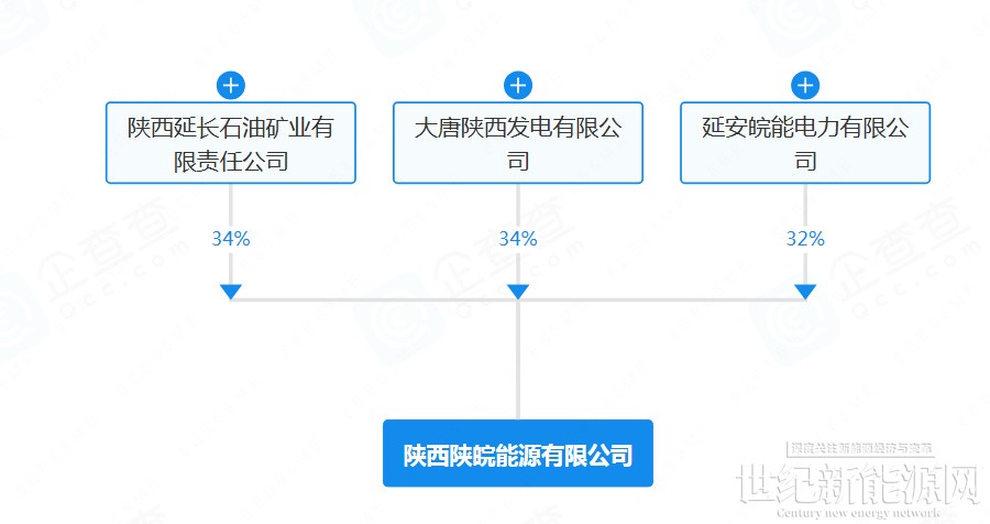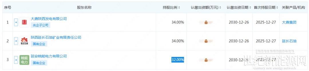 股权穿透图显示,该公司由大唐陕西发电有限公司(34.00%)、陕西延长石油矿业有限责任公司(34.00%)、延安皖能电力有限公司(32.00%)共同持股。
