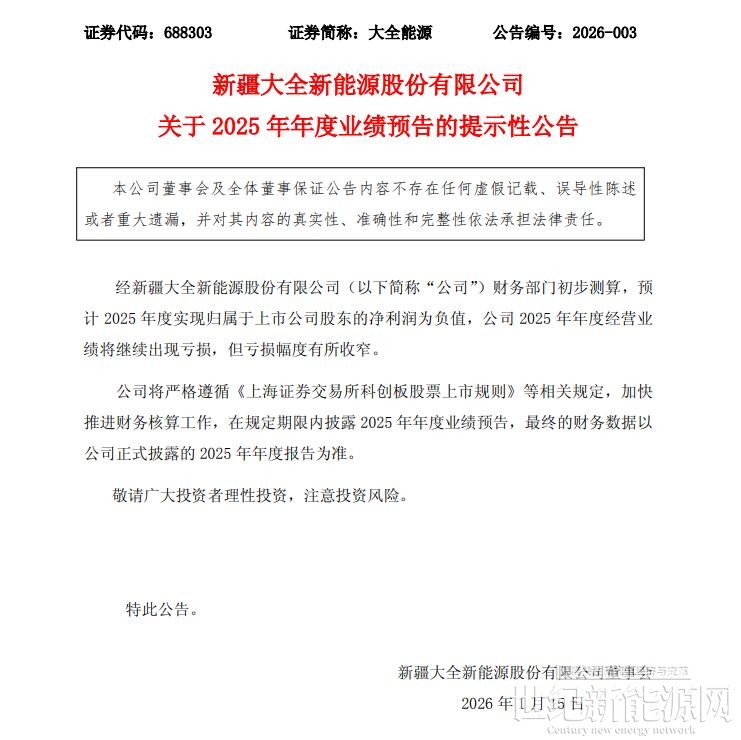 1月14日晚间,大全能源发布关于2025年年度业绩预告。