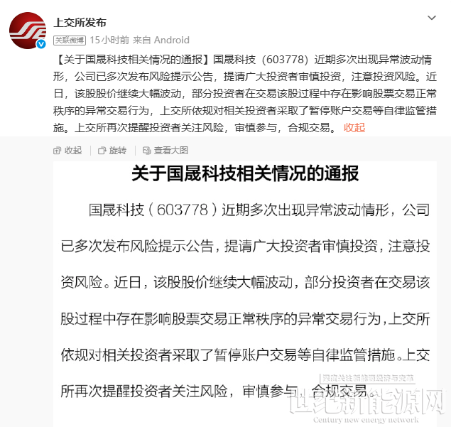 1月14日,上交所微博发布【关于国晟科技相关情况的通报】。