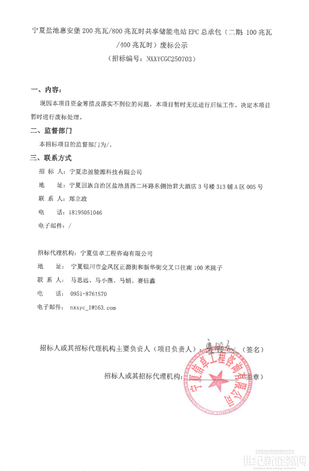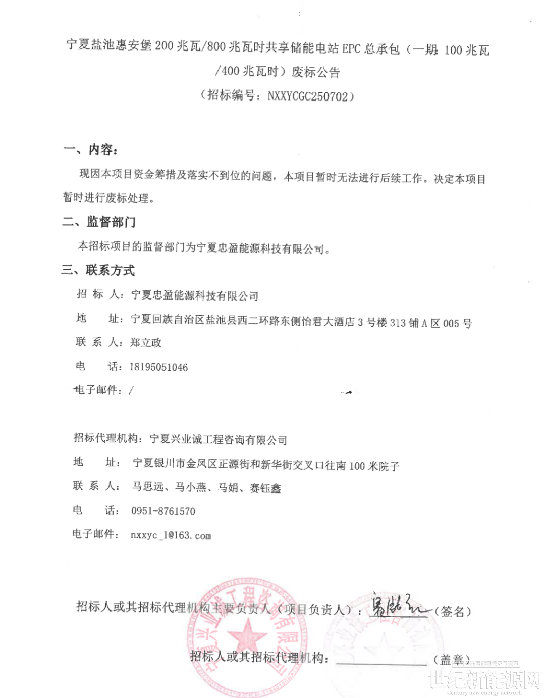 1月14日,宁夏盐池惠安堡200兆瓦/800兆瓦时共享储能电站EPC总承包(一期、二期)项目废标。