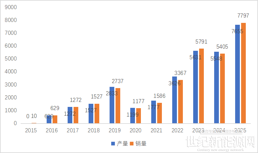2025年全年,全国燃料电池汽车产销数据分别为7655辆和7797辆。至此,2015年至2025年全国燃料电池汽车累计产量和销量分别是31697辆和31298辆。