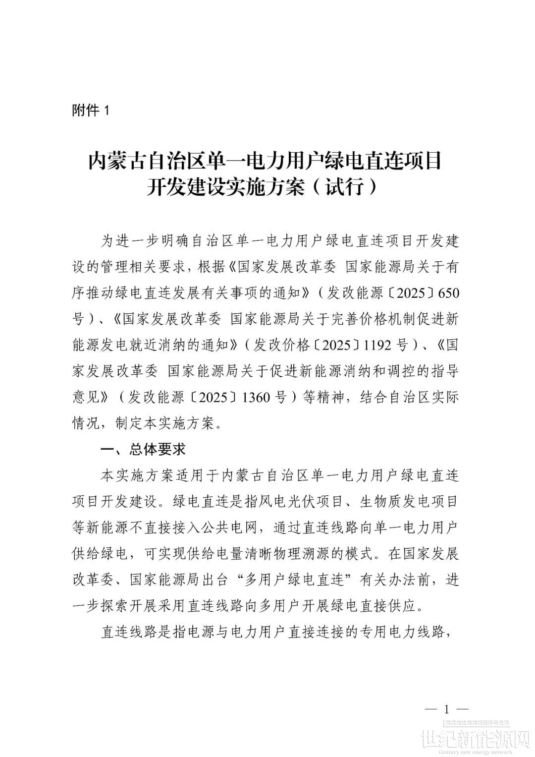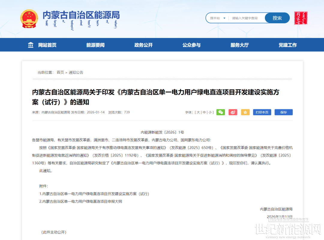 1月14日,内蒙古自治区能源局关于印发《内蒙古自治区单一电力用户绿电直连项目开发建设实施方案(试行)》的通知。
