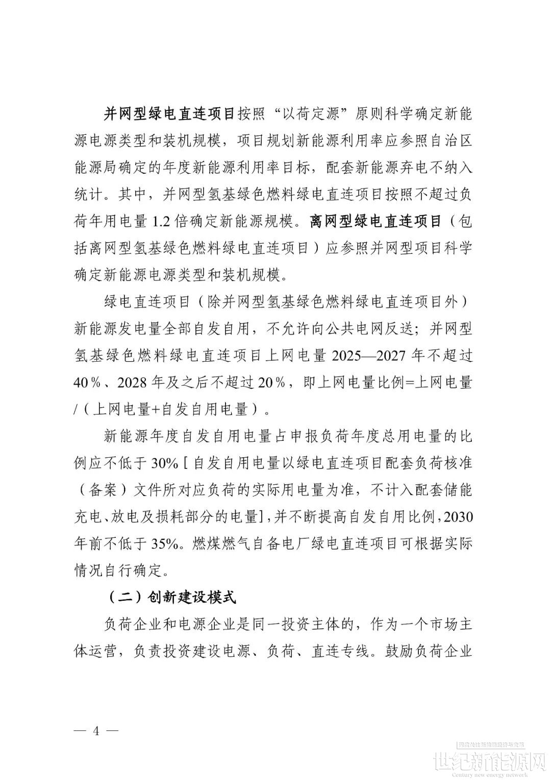 绿电直连项目(除并网型氢基绿色燃料绿电直连项目外)新能源发电量全部自发自用,不允许向公共电网反送;并网型氢基绿色燃料绿电直连项目上网电量2025—2027年不超过40%、2028年及之后不超过20%,即上网电量比例=上网电量/(上网电量+自发自用电量)。