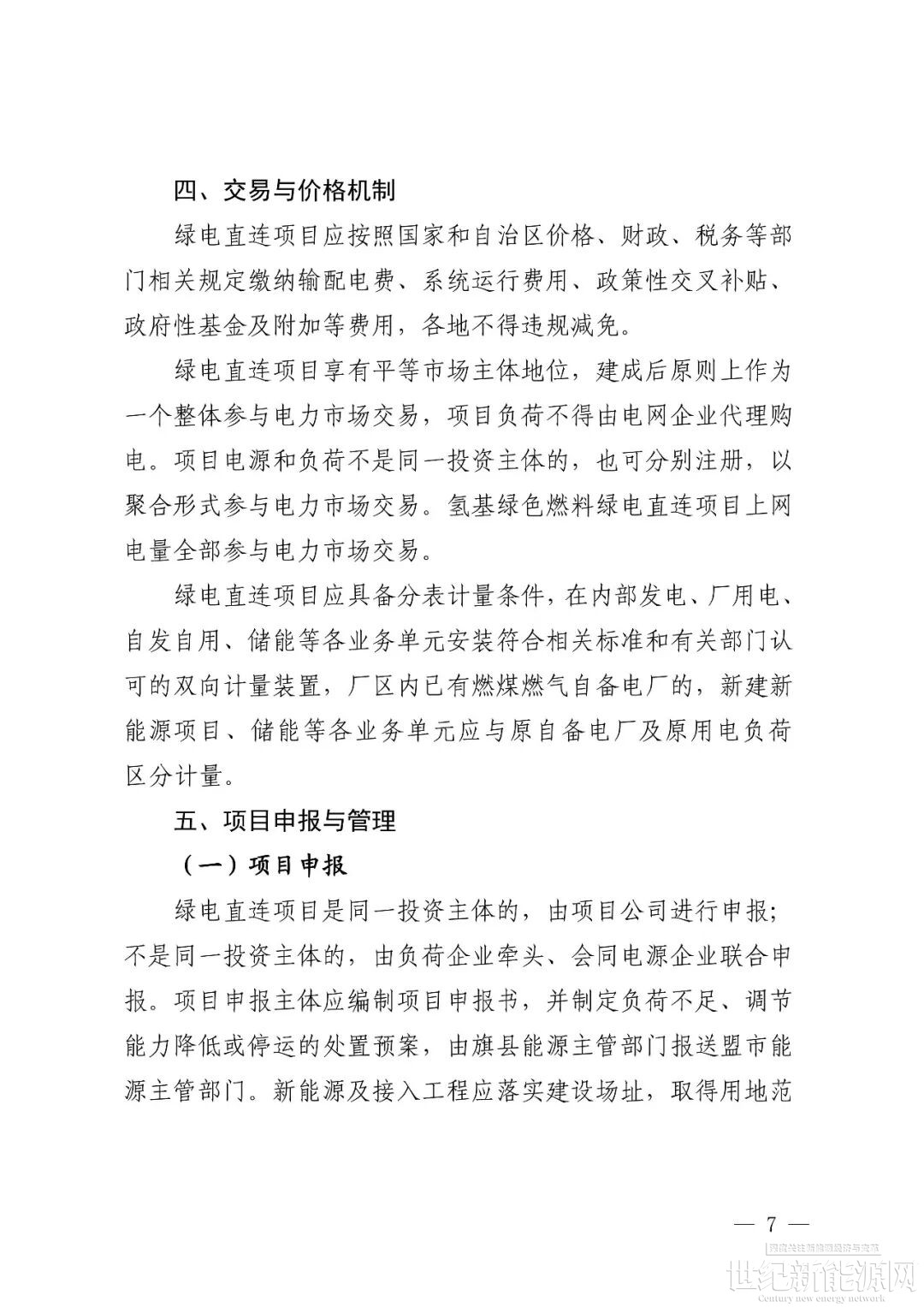 (一)项目申报 绿电直连项目是同一投资主体的,由项目公司进行申报;不是同一投资主体的,由负荷企业牵头、会同电源企业联合申报。项目申报主体应编制项目申报书,并制定负荷不足、调节能力降低或停运的处置预案,由旗县能源主管部门报送盟市能源主管部门。新能源及接入工程应落实建设场址,取得用地范围、坐标和限制性因素排查文件,包括但不限于自然资源、林草、环保、文物、军事等部门支持意见。 鼓励盟市(省区)间加强沟通协作,支持新能源开发资源不足的盟市(省区)突破地域限制,在与周边盟市(省区)协商一致的情况下,依据发展需要谋划建设绿电直连跨盟市(省区)合作项目。跨盟市项目由相关盟市能源主管部门联合组织申报。