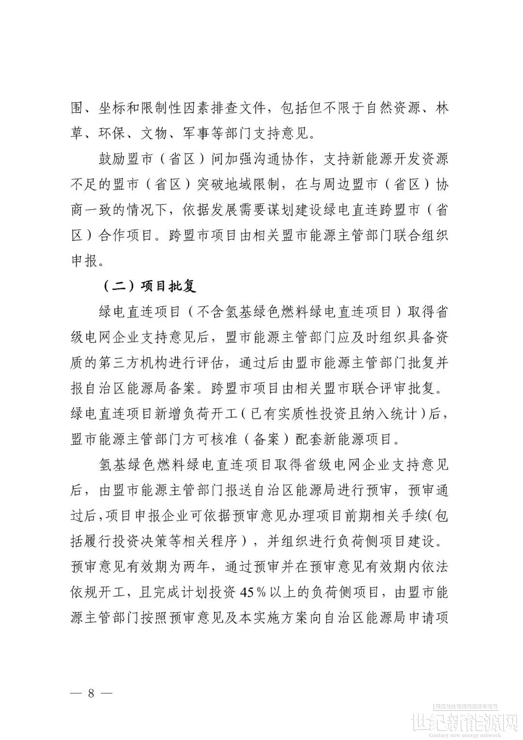 (二)项目批复 绿电直连项目(不含氢基绿色燃料绿电直连项目)取得省级电网企业支持意见后,盟市能源主管部门应及时组织具备资质的第三方机构进行评估,通过后由盟市能源主管部门批复并报自治区能源局备案。跨盟市项目由相关盟市联合评审批复。绿电直连项目新增负荷开工(已有实质性投资且纳入统计)后,盟市能源主管部门方可核准(备案)配套新能源项目。 氢基绿色燃料绿电直连项目取得省级电网企业支持意见后,由盟市能源主管部门报送自治区能源局进行预审,预审通过后,项目申报企业可依据预审意见办理项目前期相关手续(包括履行投资决策等相关程序),并组织进行负荷侧项目建设。预审意见有效期为两年,通过预审并在预审意见有效期内依法依规开工,且完成计划投资45%以上的负荷侧项目,由盟市能源主管部门按照预审意见及本实施方案向自治区能源局申请项目电源建设规模。