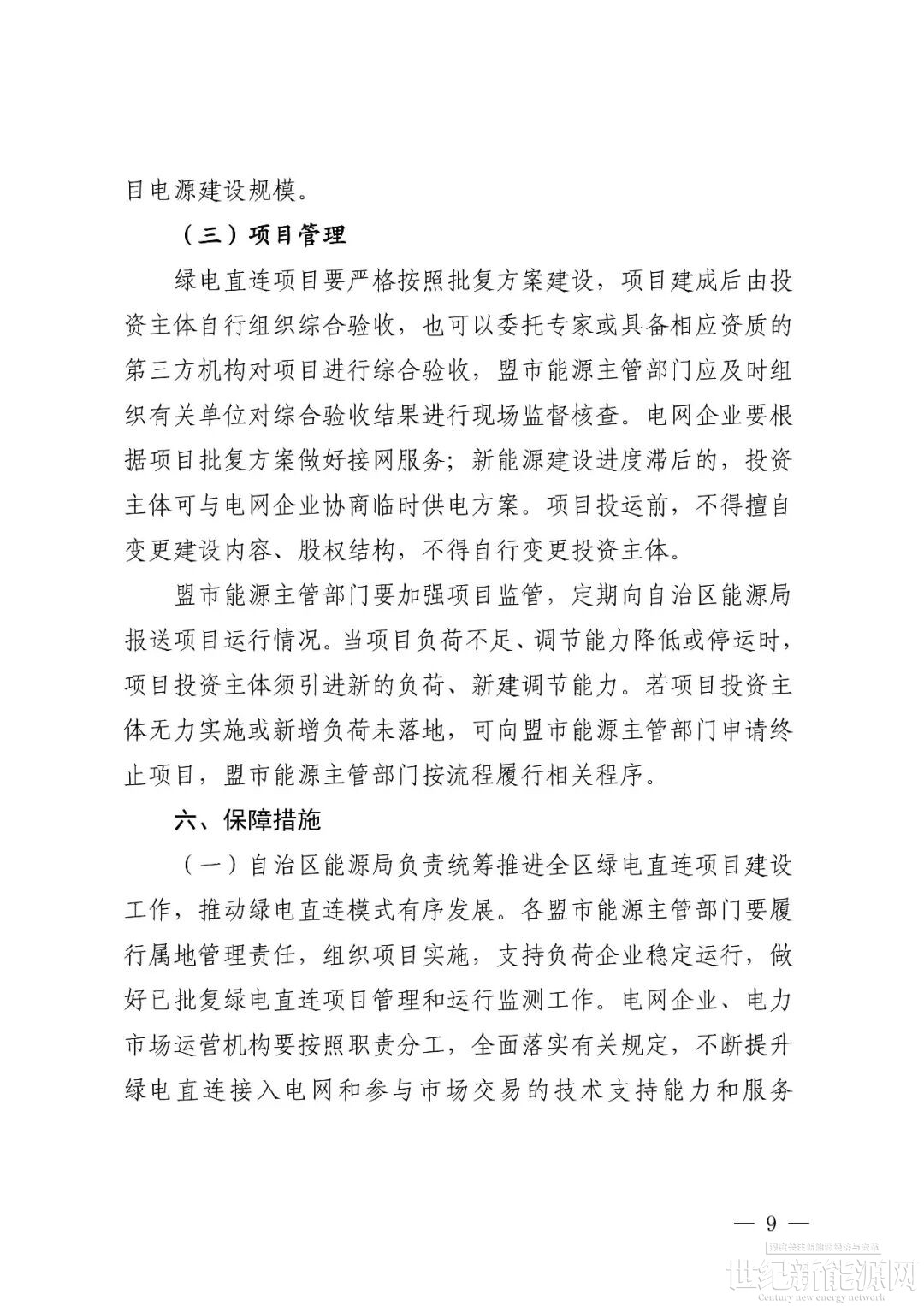 (三)项目管理 绿电直连项目要严格按照批复方案建设,项目建成后由投资主体自行组织综合验收,也可以委托专家或具备相应资质的第三方机构对项目进行综合验收,盟市能源主管部门应及时组织有关单位对综合验收结果进行现场监督核查。电网企业要根据项目批复方案做好接网服务;新能源建设进度滞后的,投资主体可与电网企业协商临时供电方案。项目投运前,不得擅自变更建设内容、股权结构,不得自行变更投资主体。 盟市能源主管部门要加强项目监管,定期向自治区能源局报送项目运行情况。当项目负荷不足、调节能力降低或停运时,项目投资主体须引进新的负荷、新建调节能力。若项目投资主体无力实施或新增负荷未落地,可向盟市能源主管部门申请终止项目,盟市能源主管部门按流程履行相关程序。