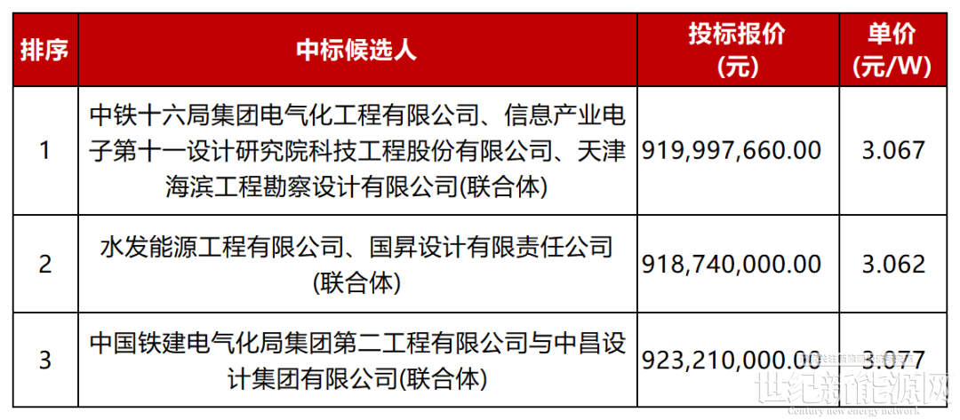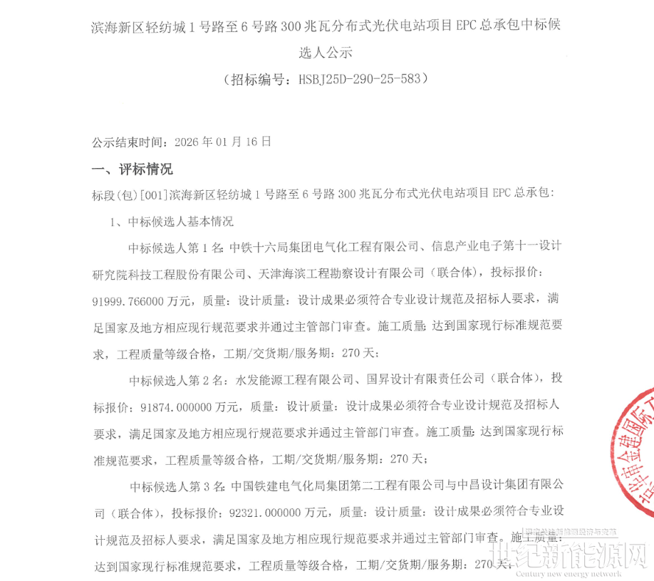 1月14日,滨海新区轻纺城1号路至6号路300兆瓦分布式光伏电站项目EPC总承包中标候选人公示,项目招标人为中谷(天津)新能源有限公司。根据中标候选人公示:项目中标单价为3.062~3.077元/W,具体如下:
