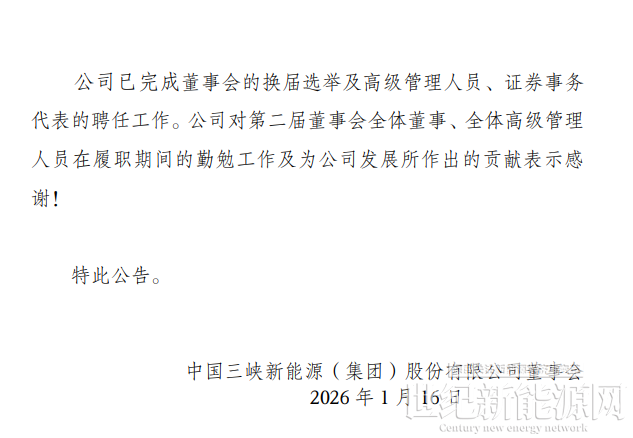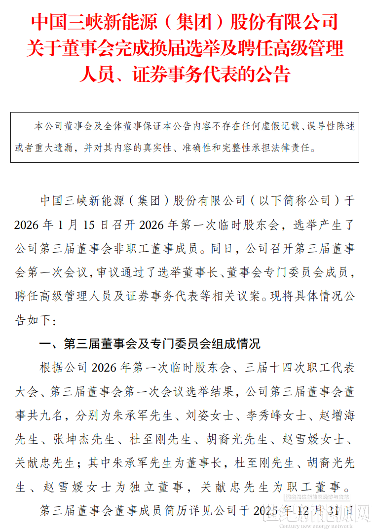 2026年1月16日,三峡能源发布公告,宣布公司董事会换届选举及高级管理人员聘任工作圆满完成。根据公告,公司第三届董事会共由9名董事组成,朱承军当选董事长,杜至刚、胡裔光、赵雪媛担任独立董事,关献忠为职工董事。董事会下设四大专门委员会,分工明确保障公司规范运作。