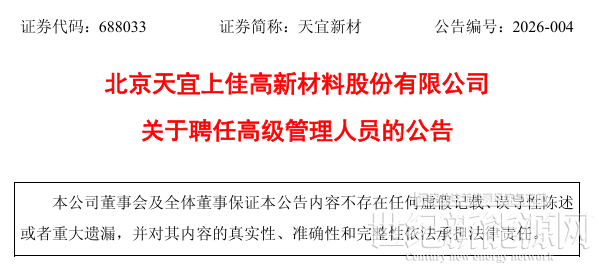 1月16日,天宜新材发布关于聘任高级管理人员的公告。