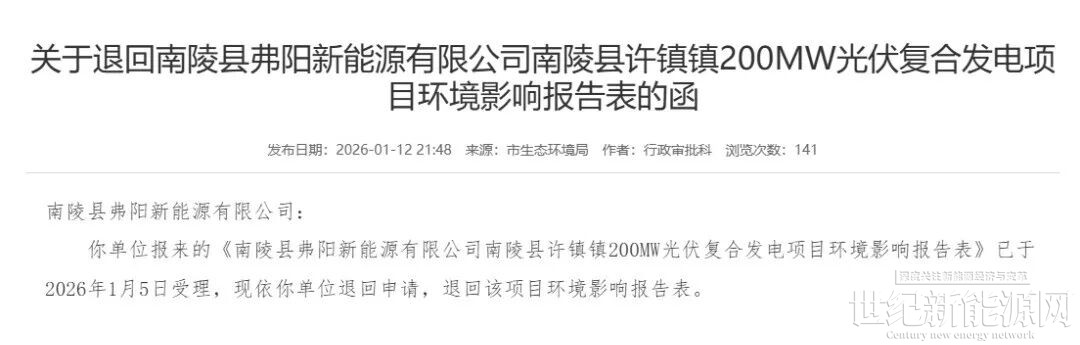 2026年1月12日下午,安徽省芜湖市生态环境局官网发布“关于退回南陵县弗阳新能源有限公司南陵县许镇镇200MW光伏复合发电项目环境影响报告表的函”。