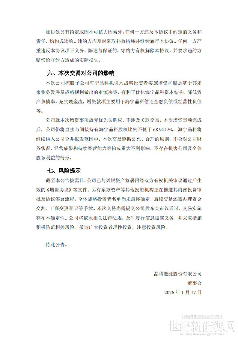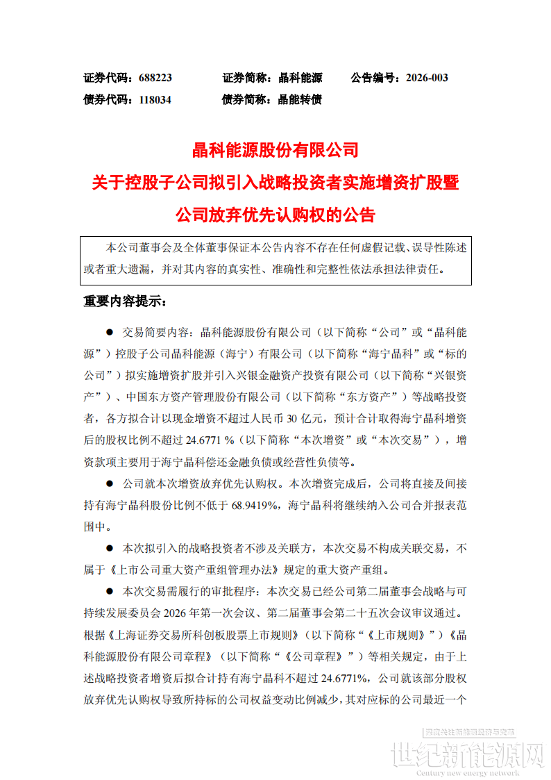 1月17日,晶科能源发布关于控股子公司拟引入战略投资者实施增资扩股暨公司放弃优先认购权的公告。