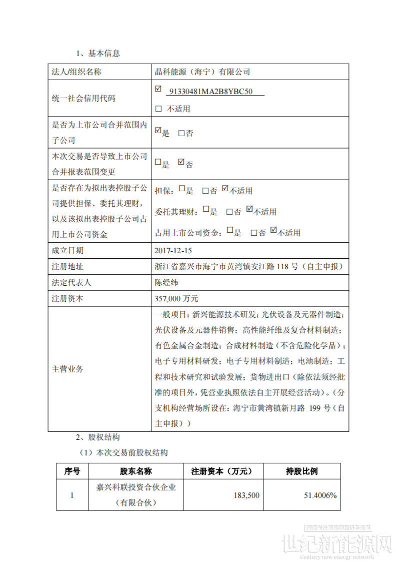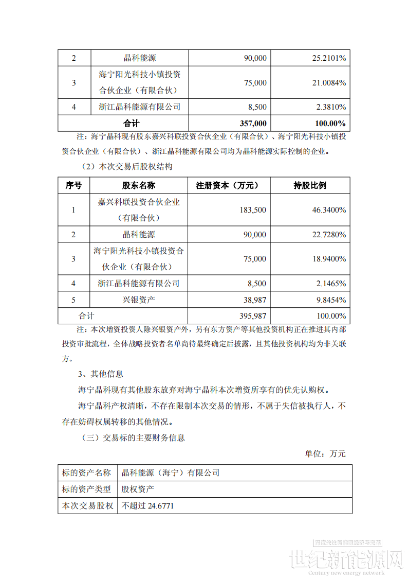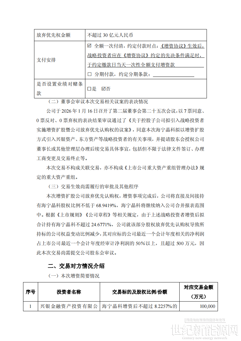 晶科能源就本次增资放弃优先认购权。本次增资完成后,晶科能源将直接及间接持有海宁晶科股份比例不低于 68.9419%,海宁晶科将继续纳入晶科能源合并报表范围中。