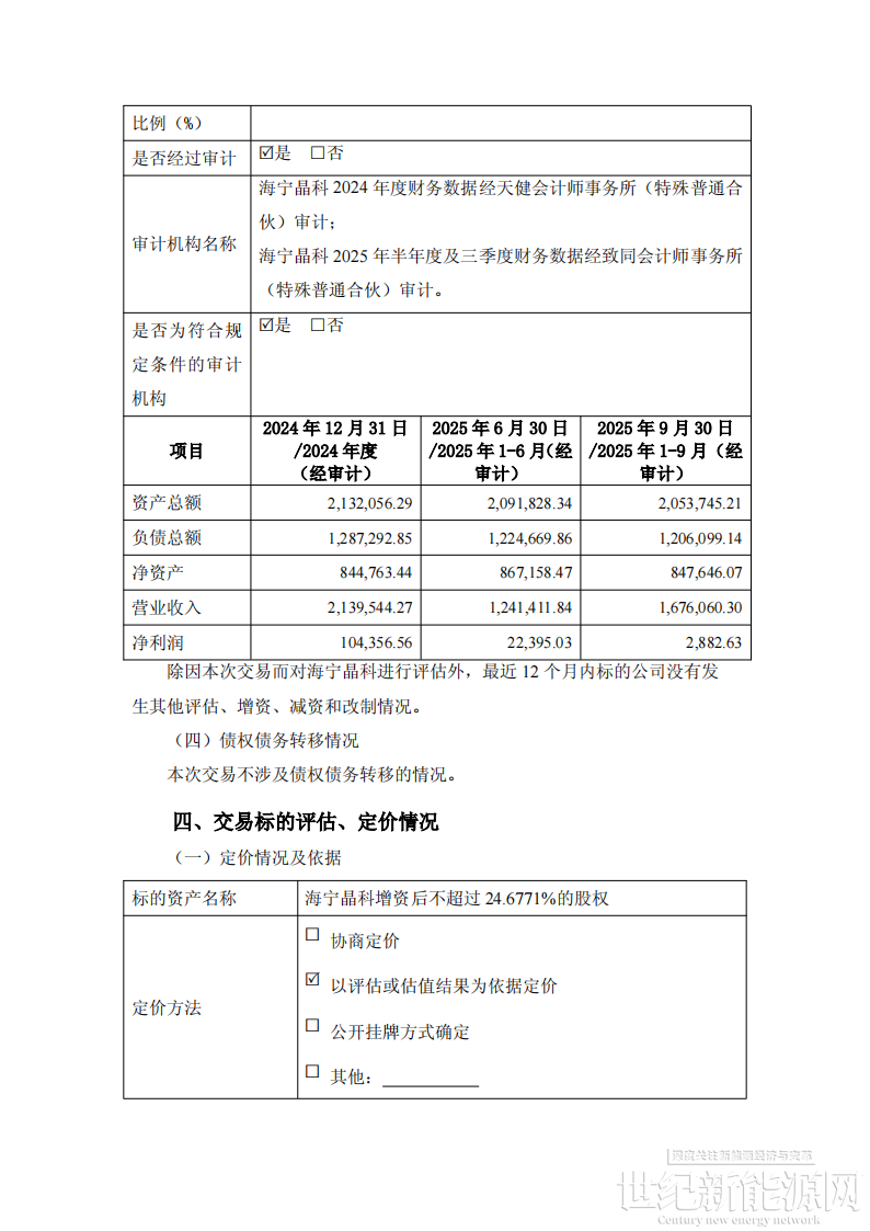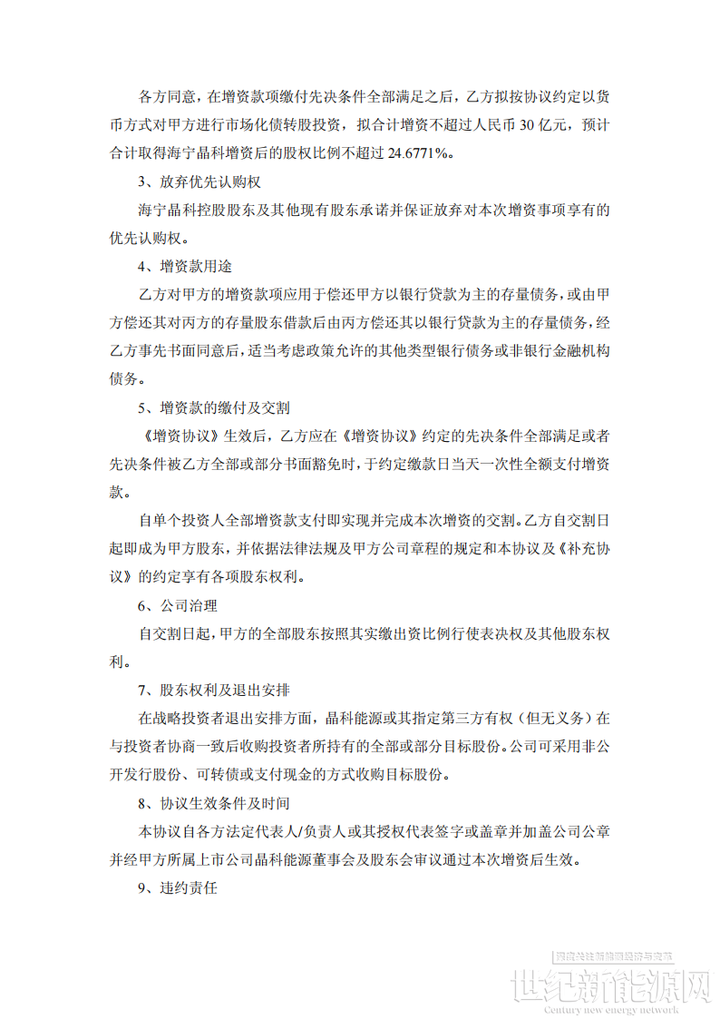 公告显示,晶科能源控股子公司晶科能源(海宁)有限公司(以下简称“海宁晶科”或“标的公司”)拟实施增资扩股并引入兴银金融资产投资有限公司、中国东方资产管理股份有限公司等战略投资者,各方拟合计以现金增资不超过人民币 30亿元,预计合计取得海宁晶科增资后的股权比例不超过 24.6771 %,增资款项主要用于海宁晶科偿还金融负债或经营性负债等。