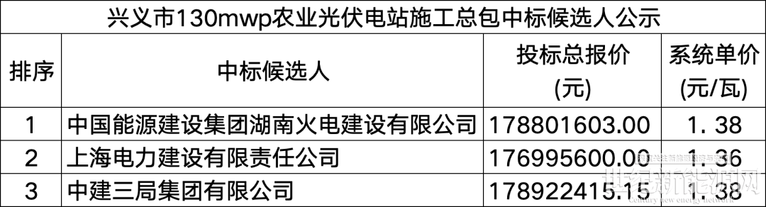 1月16日,兴义市清水河火电厂灰场农业光伏电站施工总承包中标候选人公示,中国能源建设集团湖南火电建设有限公司以1.38元/瓦位列第一候选人,招标人为贵州兴电新能源发电有限公司。