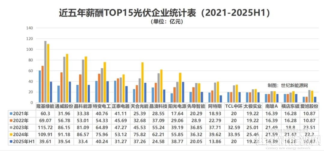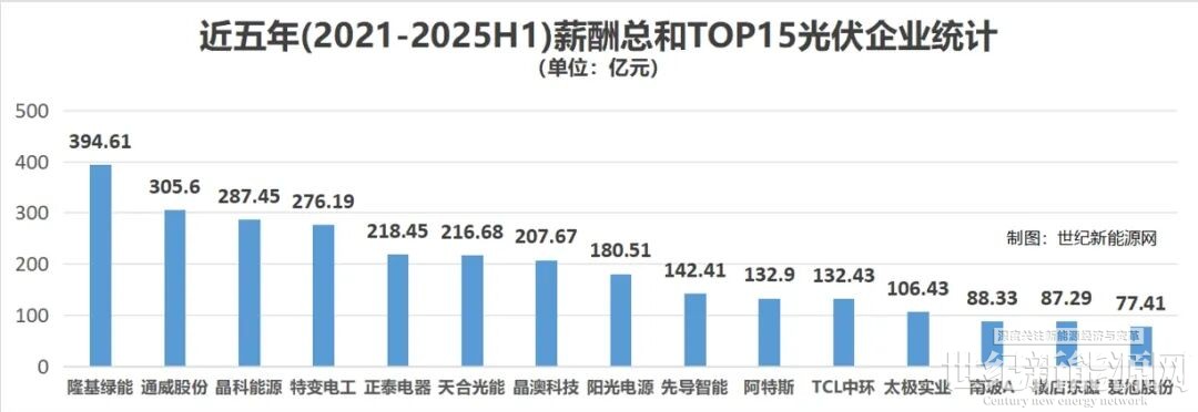 从薪酬支出规模来看,2021-2025H1,TOP15光伏企业共支出超过2854亿元薪酬。其中,隆基绿能累计支付薪酬达394.61亿元,稳居126家A股光伏上市企业首位。