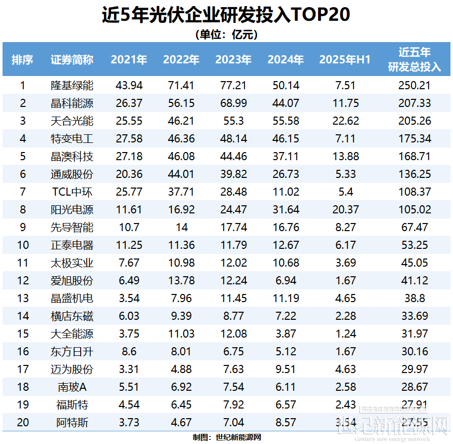 持续的研发投入,彰显的是企业的长远发展眼光。根据黑鹰光伏的统计,从2021年至2025年上半年,135家光伏上市企业累计研发投入达2593亿元。从不同企业的整体研发投入力度来看,近五年时间里累计研发投入最多的是隆基绿能,以超250亿元的研发投入位居第一。