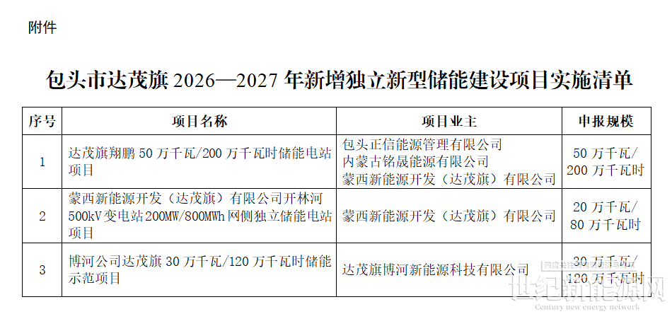 按照《内蒙古自治区能源局关于规范独立新型储能电站管理有关事宜的通知》(内能源电力字〔2025〕656号)、《内蒙古自治区能源局关于组织申报2026年独立新型储能建设项目清单的通知》(内能源电力字〔2025〕753号)等文件精神,经第三方服务机构评审优选,形成了包头市达茂旗2026—2027年新增独立新型储能建设项目实施清单,现予以公示。