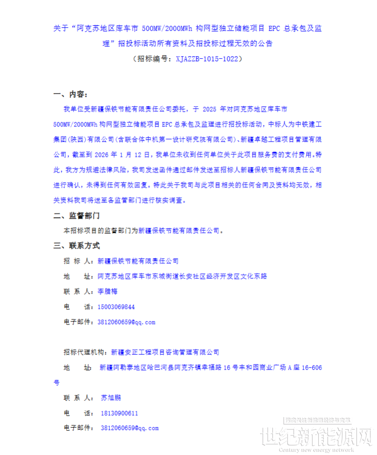 1月16日,关于“阿克苏地区库车市500MW/2000MWh构网型独立储能项目EPC总承包及监理"招投标活动所有资料及招投标过程无效的公告发布。