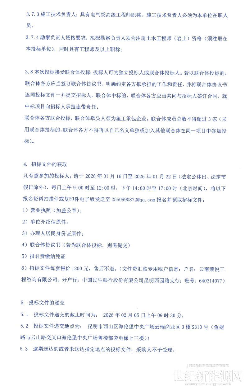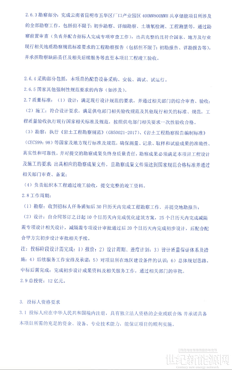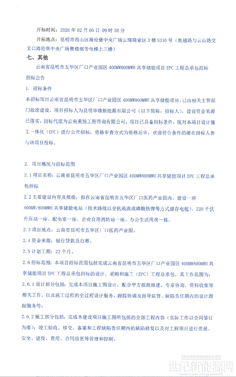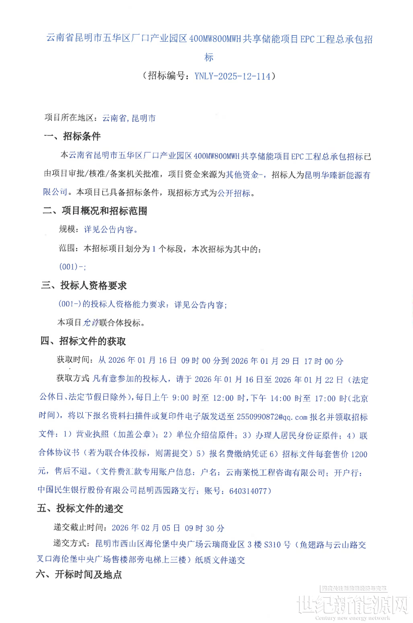 1月16日,云南省昆明市五华区厂口产业园区400MW/800MWh共享储能项目EPC工程总承包招标发布。