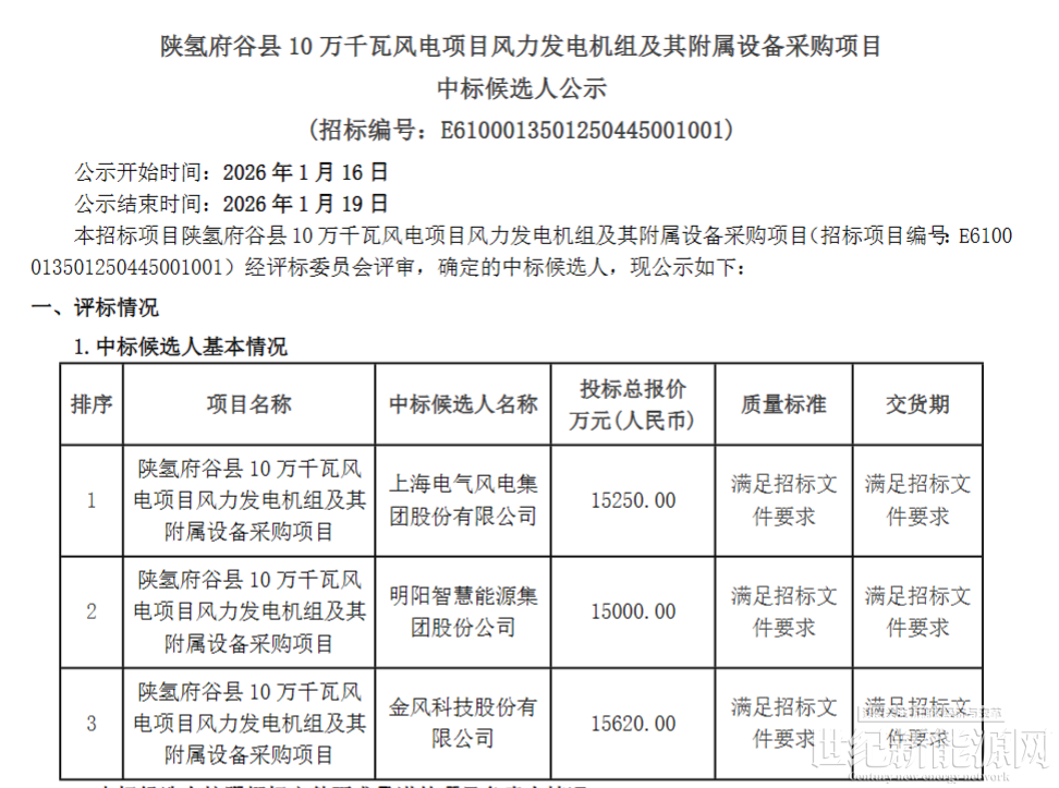 1月16日,陕氢府谷县10万千瓦风电项目风力发电机组及其附属设备采购项目中标候选人公示。公告显示,第一中标候选人:电气风电,投标报价:15250.00万元。第二中标候选人:明阳智能,投标报价:15000.00万元。第三中标候选人:金风科技,投标报价:15620.00万元。